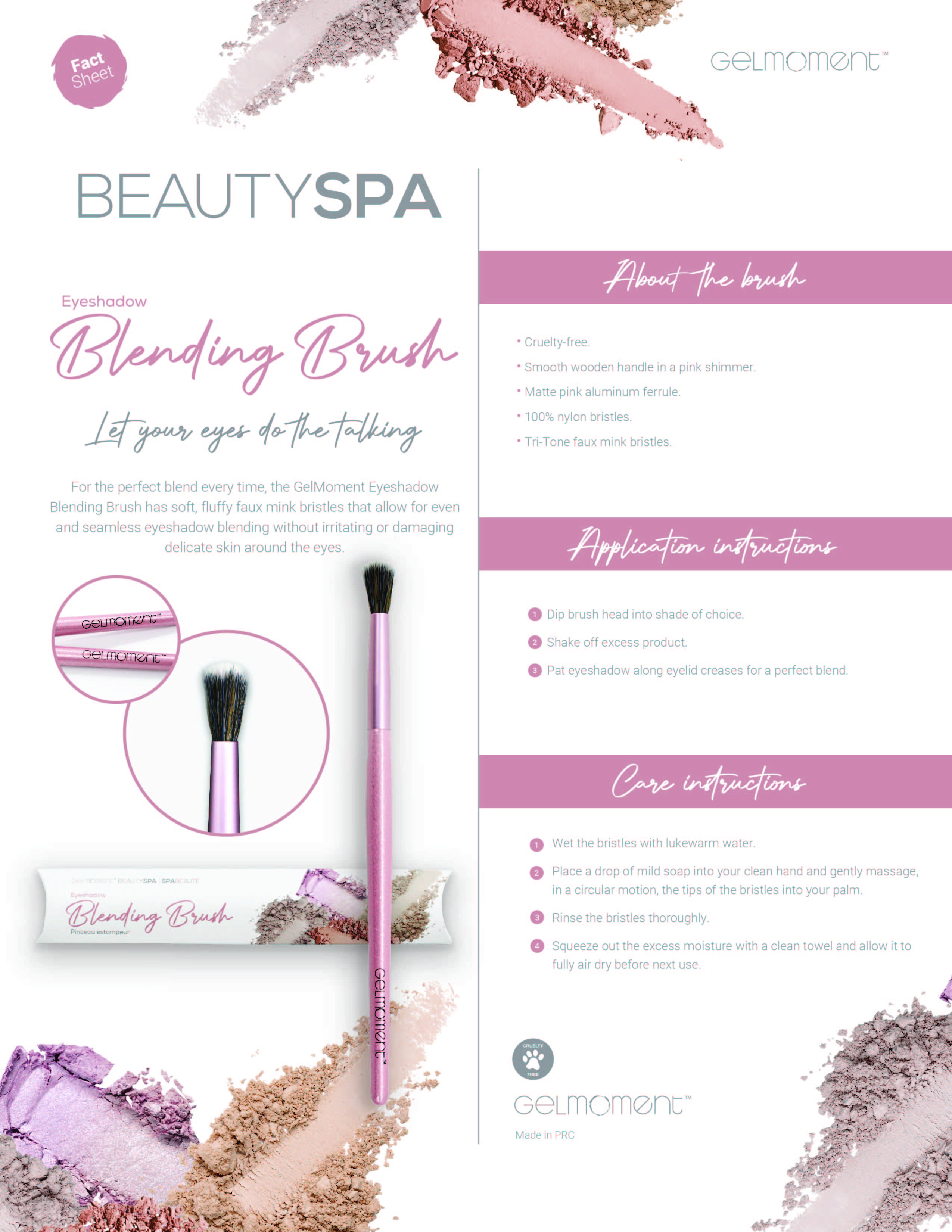 Maximize the potential of your GelMoment Eyeshadow Palettes by applying them with our quality crafted Eyeshadow Shader Brush and Blending Brush, both made with 100% nylon, tri-tone faux mink bristles. Let your eyes do the talking with results that speak for themselves.